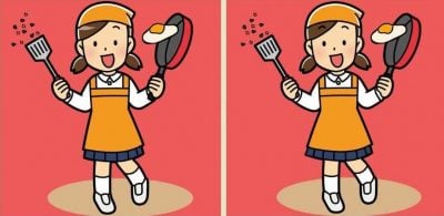 Oba rysunki przedstawiają dziewczynkę robiącą jajecznicę. I wygląda na to, że ma kłopoty, bo smażone jajko zaraz spadnie na podłogę z patelni.