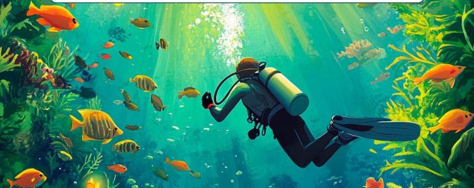 Obrazek przedstawia nurka pośród podwodnego krajobrazu. Twoim zadaniem jest uważne przyjrzenie się obrazkowi i znalezienie w nim rażącego błędu. Jeden z przedstawionych szczegółów jest niemożliwy.