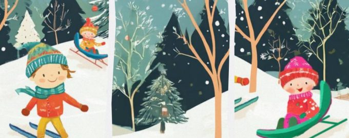 Przed tobą jest grupa szczęśliwych dzieci cieszących się śniegiem i prawdziwą zimową pogodą w lesie. Maluchy zjeżdżają na sankach, a ich starsi koledzy jeżdżą na nartach.