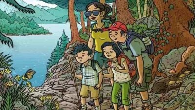 Zdjęcie przedstawia kobietę i jej dzieci na łonie natury. Wygląda na to, że robią zdjęcia. Gdzieś w pobliżu ukrywa się również wąż, którego należy znaleźć.