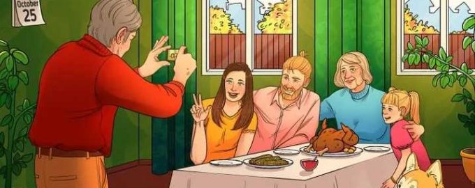 Na kolejnym zdjęciu widzimy rodzinę sfotografowaną przy stole z okazji Święta Dziękczynienia. Na fakt, że rodzina obchodzi Święto Dziękczynienia wskazuje tradycyjny indyk na stole.