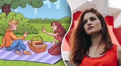 Na obrazku widzimy chłopaka i dziewczynę, którzy przyjechali w malownicze miejsce na piknik. Siedzą na kocu rozłożonym na trawie i trzymają w rękach szklanki z napojami. Za nimi widzimy chłopaka bawiącego się z dwoma psami.