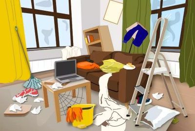 Spójrz na zdjęcie powyżej. Przedstawia ono salon wymagający generalnego sprzątania. Na podłodze i meblach leżą ubrania, poduszki na sofie są poprzewracane, a na ścianie wiszą obrazy. Na środku pokoju znajduje się również drabina, wiadro i gumowe rękawice, co sugeruje, że właściciele domu są zajęci ogólnym sprzątaniem.