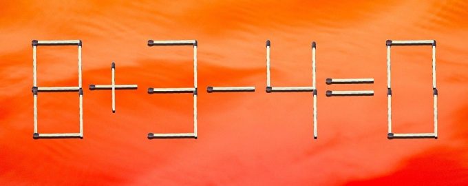 Masz przed sobą przykład 8+3-4=0=0, który jest oczywiście niepoprawny. Możesz przesunąć tylko jedną zapałkę, aby problem miał sens. Zgodnie z zasadami takich łamigłówek nie można usuwać patyczków ze znaku „=” ani go przekreślać, ale można zmieniać dowolne inne symbole i liczby.