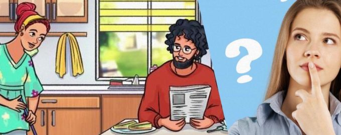Zdjęcie przedstawia parę spędzającą dzień w kuchni. Mężczyzna czyta gazetę i pije herbatę, podczas gdy kobieta myje podłogę. Twoim zadaniem jest wykrycie błędu ukrytego na tym obrazku. Musisz uważnie przyjrzeć się obrazkowi, zanim będziesz mógł odpowiedzieć na pytanie: „Co jest nie tak z tym obrazkiem?”. Aby gra była jeszcze bardziej interesująca, spróbuj znaleźć odpowiedź w ograniczonym czasie 11 sekund.